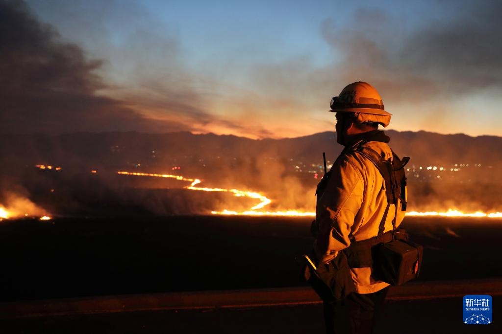 1月22日,在美国加利福尼亚州洛杉矶县卡斯泰克市的一座山丘上,消防员观察山火“休斯”的动向。