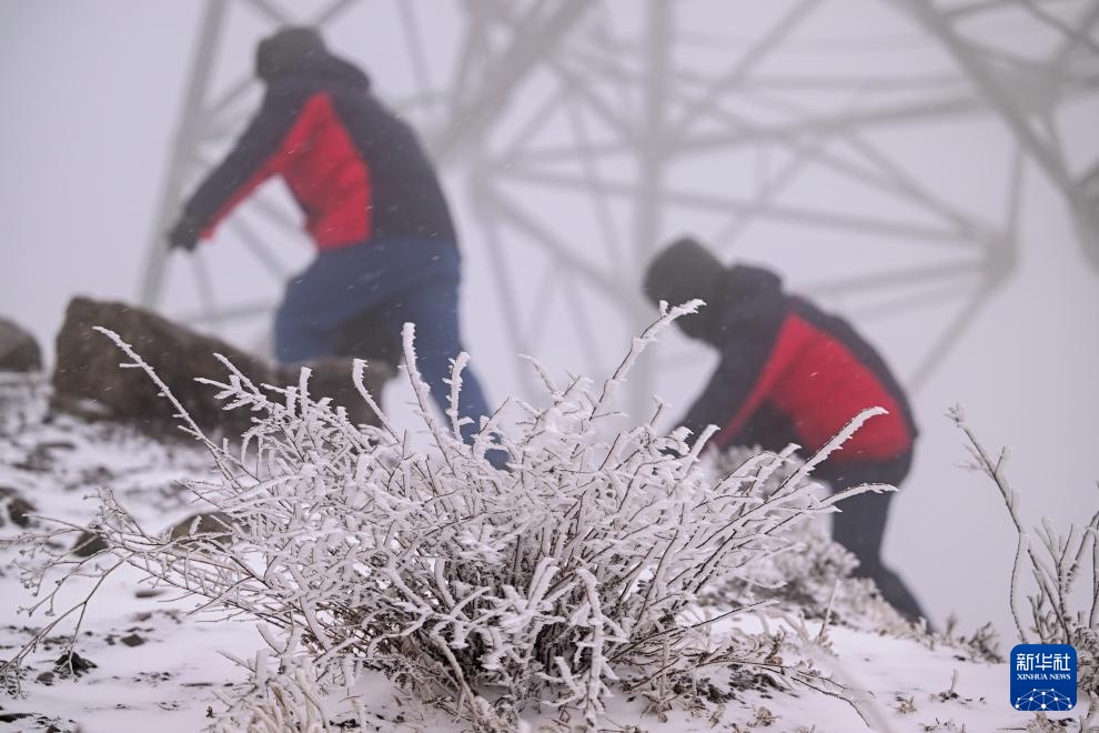 杨啸(左)和搭档李均平查看杆塔高处的覆冰情况(1月24日摄)。