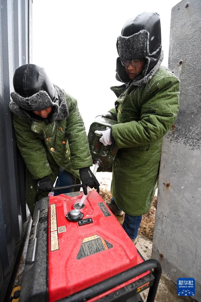 杨啸(右)和搭档李均平协力为发电机加油。这是他们在山上取暖、照明的动力来源(1月24日摄)。