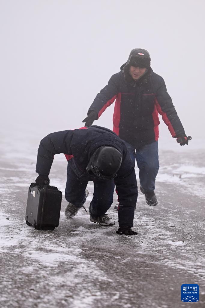 杨啸(左)和搭档李均平在夜间观测风速(1月23日摄)。
