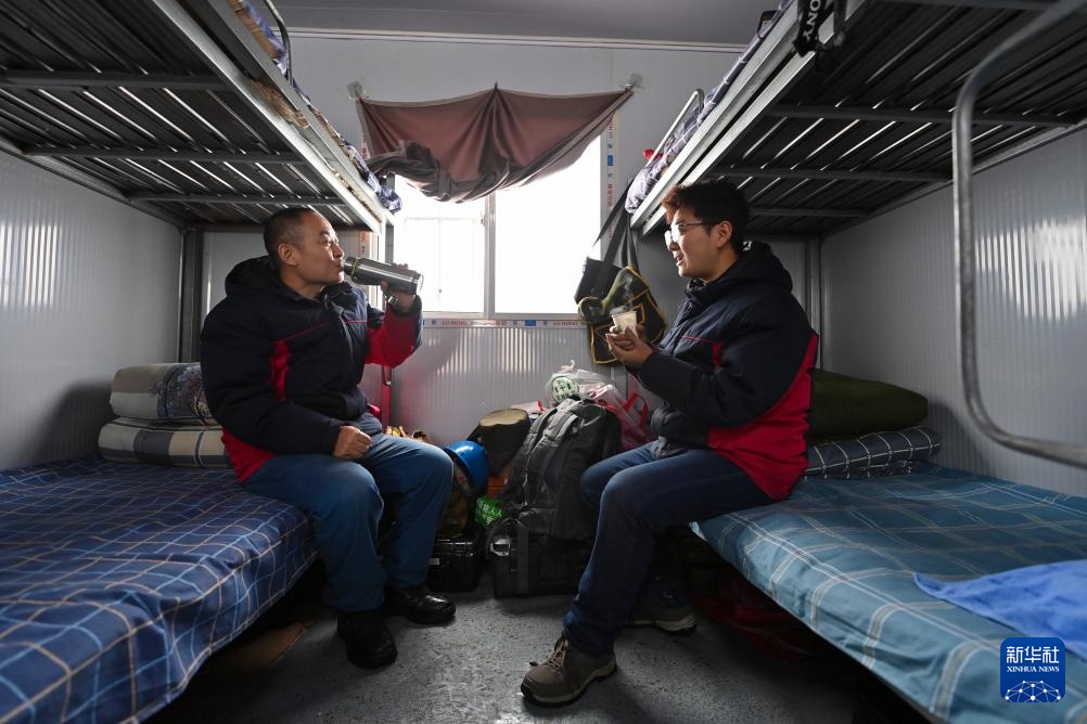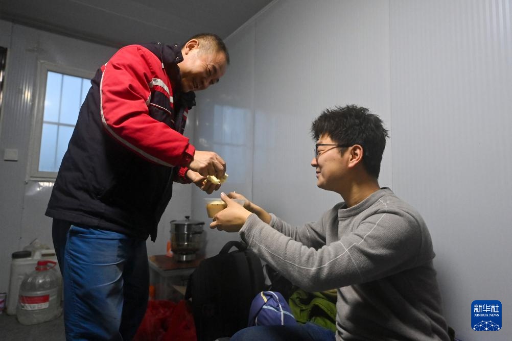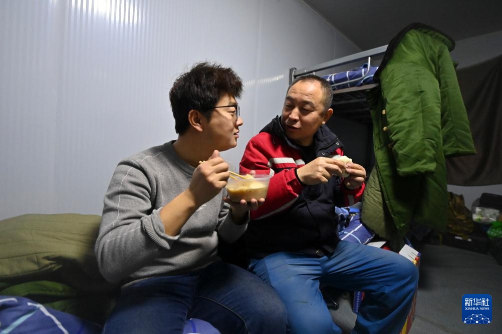 观冰哨内,李均平(右)和杨啸(左)边吃饭边聊天(1月24日摄)。