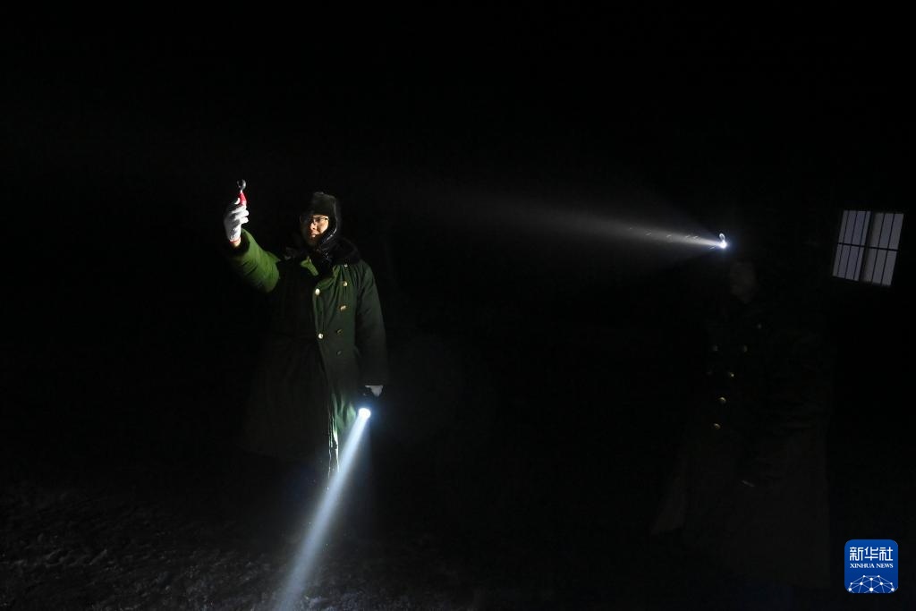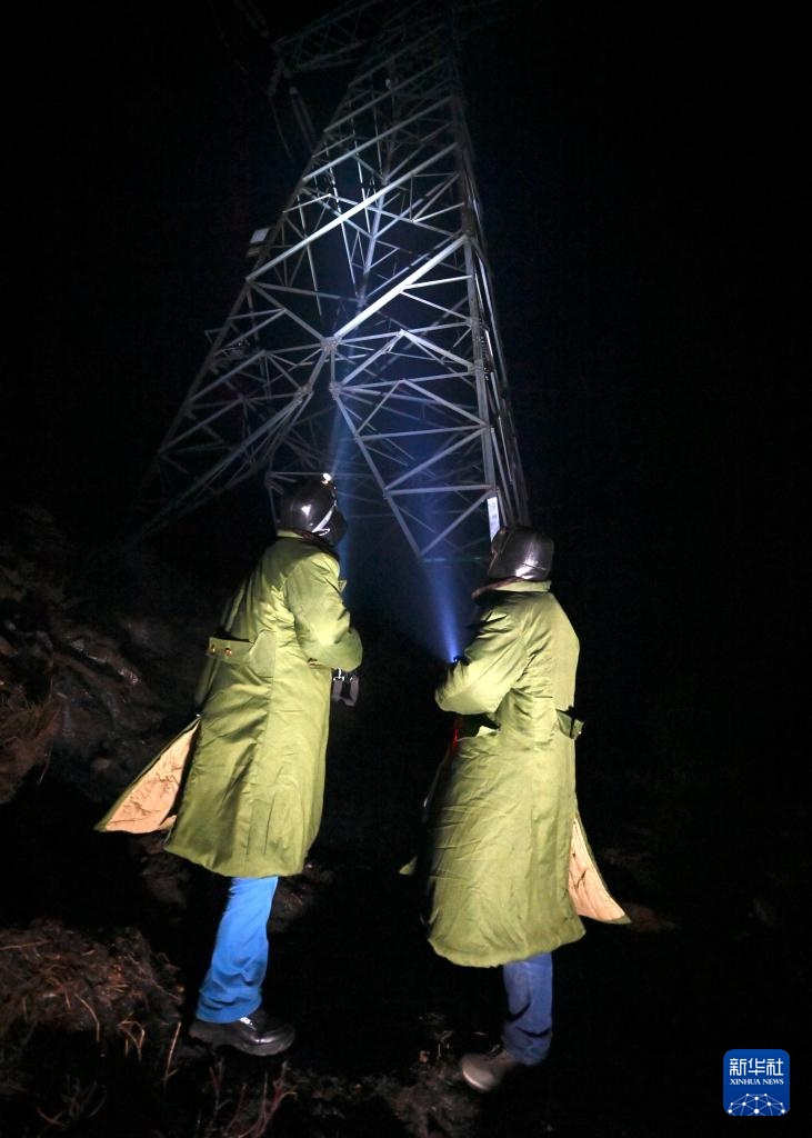 杨啸(左)和搭档李均平在夜间查看杆塔覆冰情况(1月23日摄)。