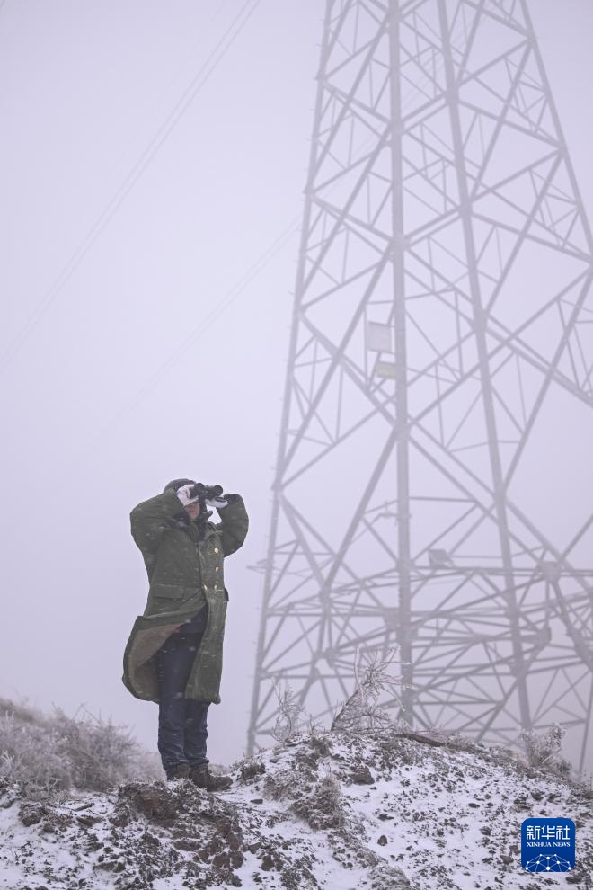 杨啸通过望远镜查看杆塔高处的覆冰情况(1月24日摄)。
