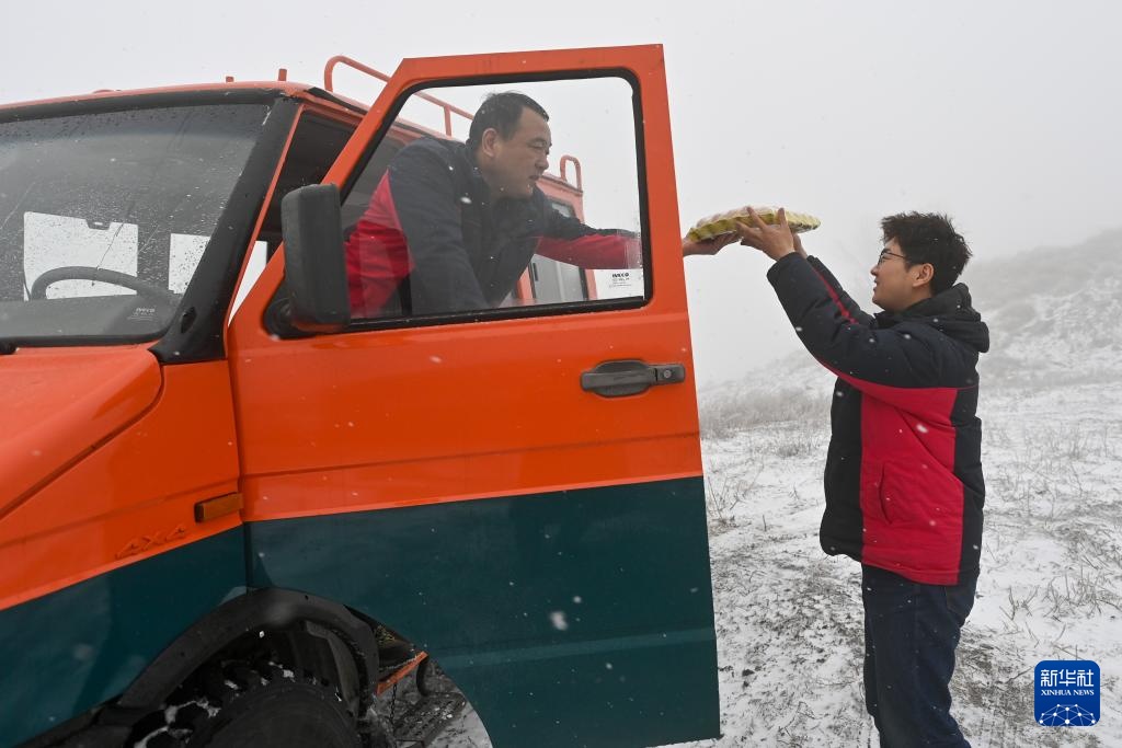 国网运城供电公司输电运检中心流动组工作人员为杨啸(右)送来物资补给(1月24日摄)。