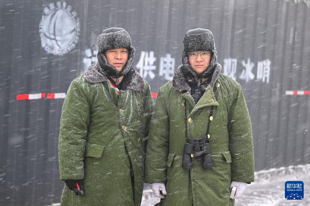杨啸(右)和搭档李均平在观冰哨前合影(1月24日摄)。