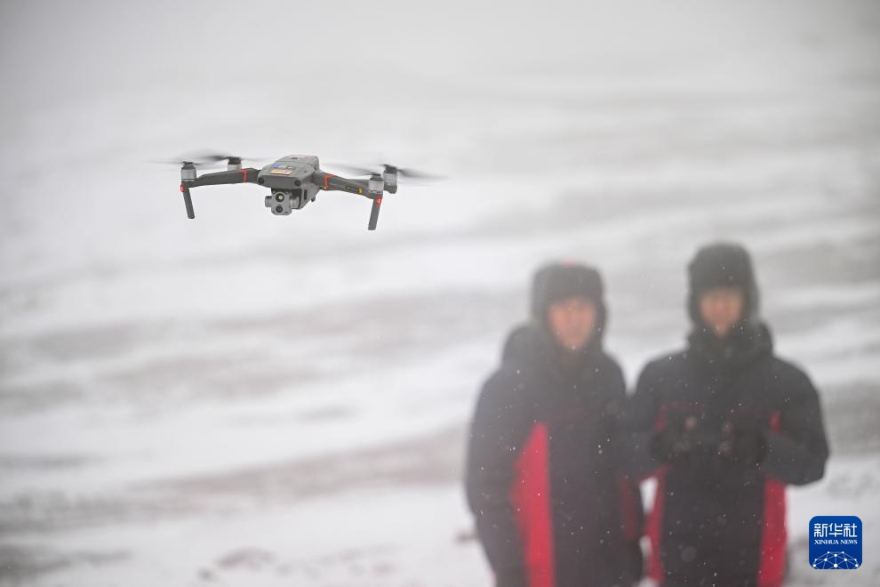 杨啸(右)和搭档李均平通过无人机查看线路运行情况(1月24日摄)。