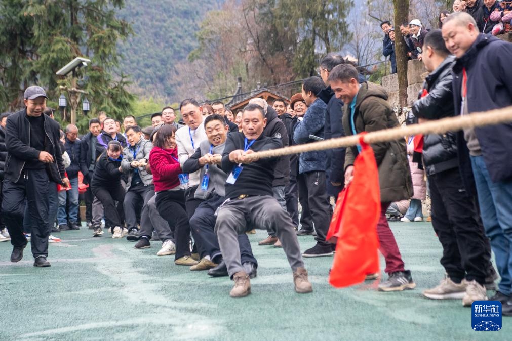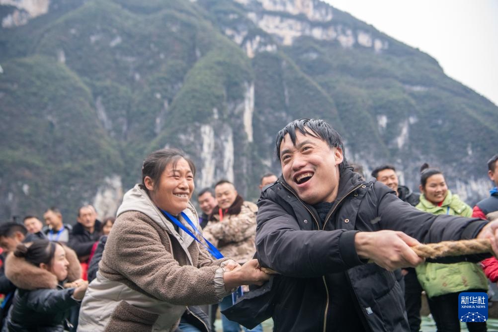 1月25日,在重庆市巫山县竹贤乡下庄村,村民和游客在乡村运动会上比赛拔河。