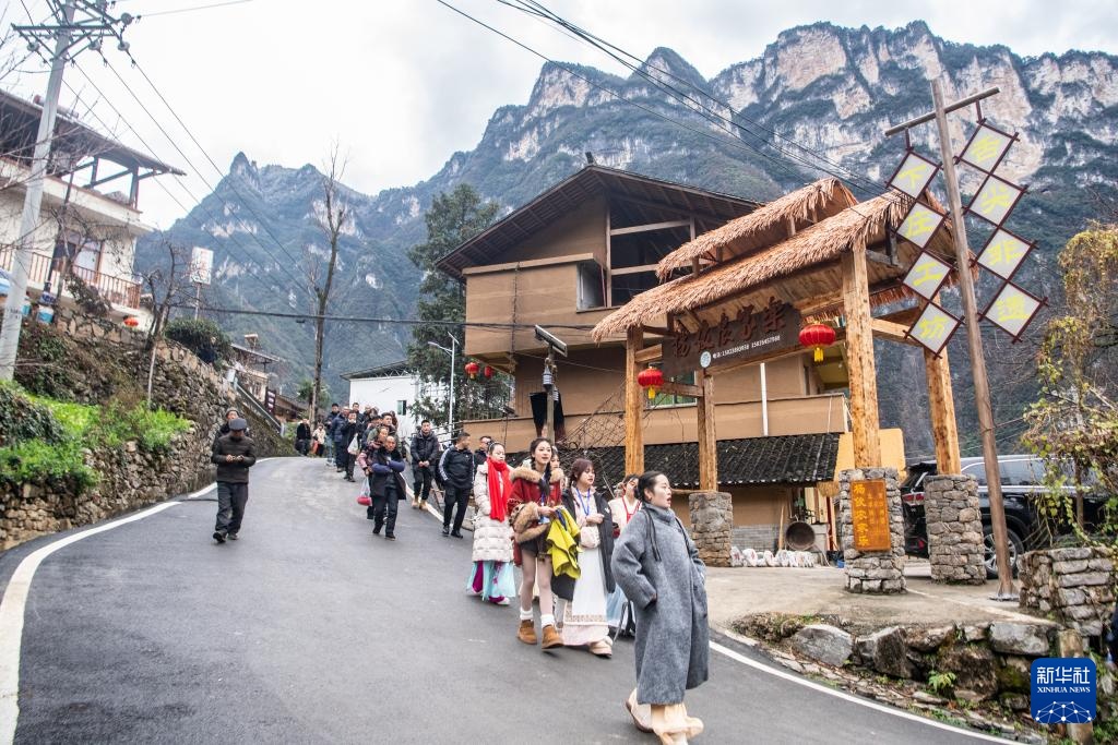 1月25日,在重庆市巫山县竹贤乡下庄村,村民和游客在村里游玩。