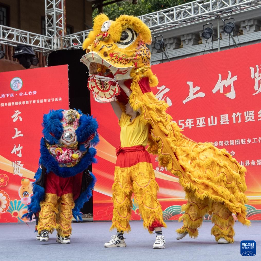1月25日,在重庆市巫山县竹贤乡下庄村,村民在舞台上表演舞狮。