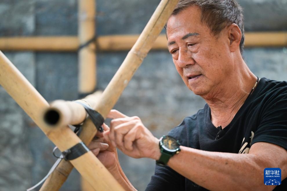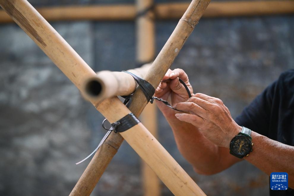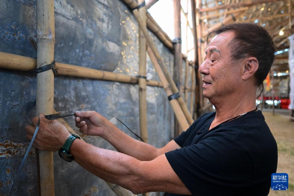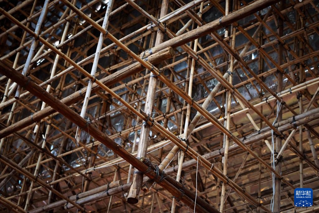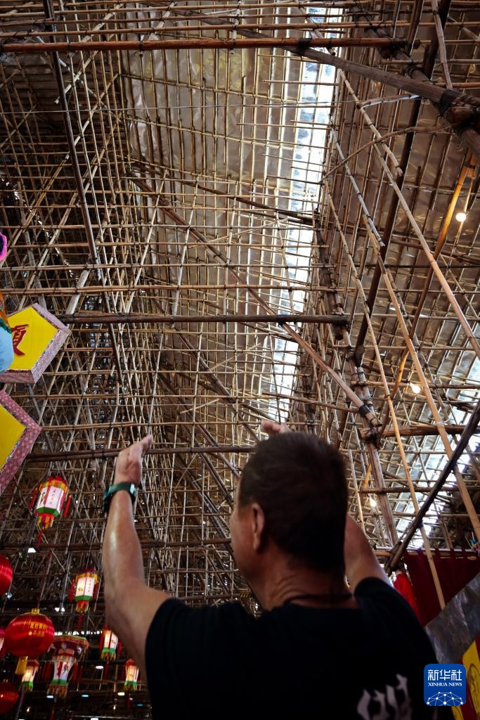 陈煜光在香港元朗厦村乡展示戏棚搭建技艺(2024年11月11日摄)。