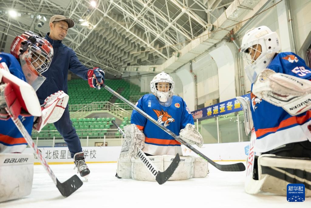 1月25日,在齐齐哈尔市的黑龙体育馆内,二马路小学翼虎冰球队教练员崔志楠(左)指导球员训练。