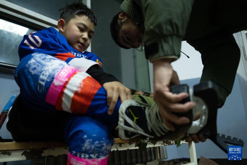 1月25日,在齐齐哈尔市的黑龙体育馆内,二马路小学翼虎冰球队队员何润泽在训练结束后脱下冰刀。