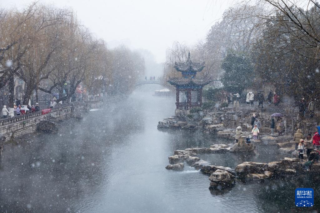 1月26日,人们在山东省济南市护城河边赏雪游玩。