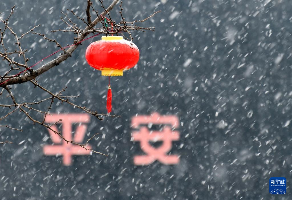 1月26日,山东省枣庄市山亭区太清湖广场树上的红灯笼落满雪花。