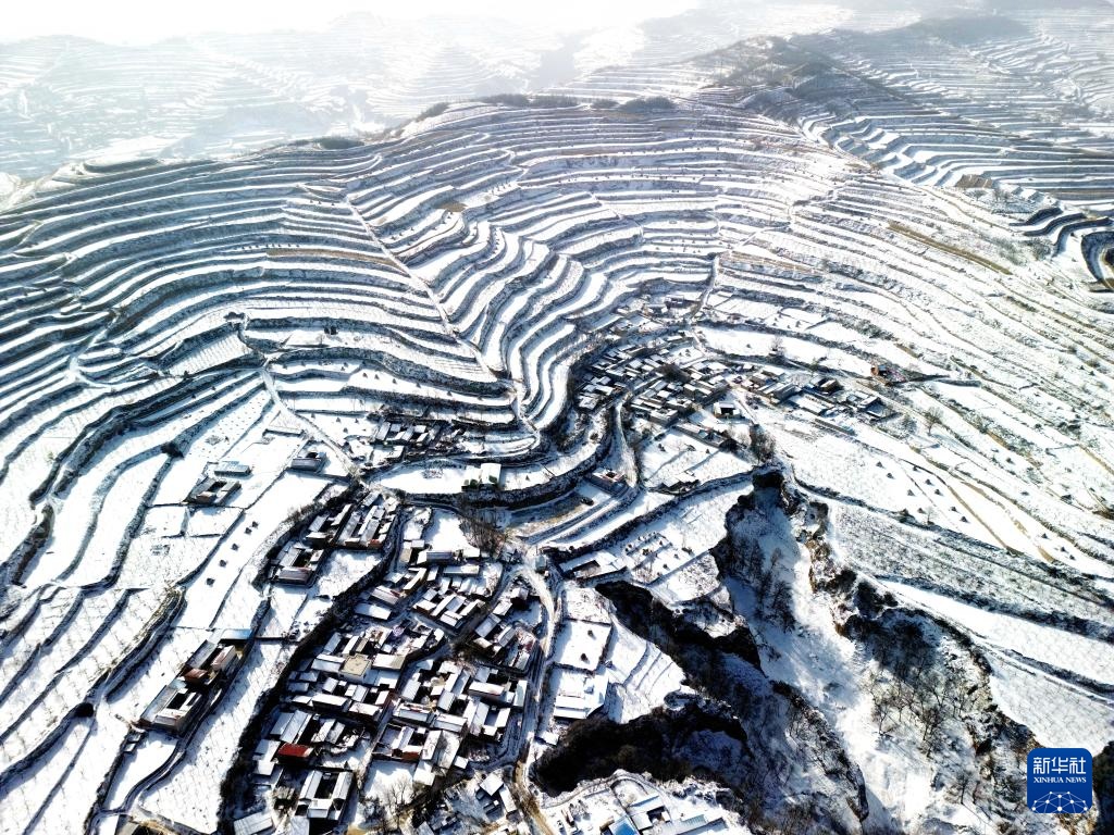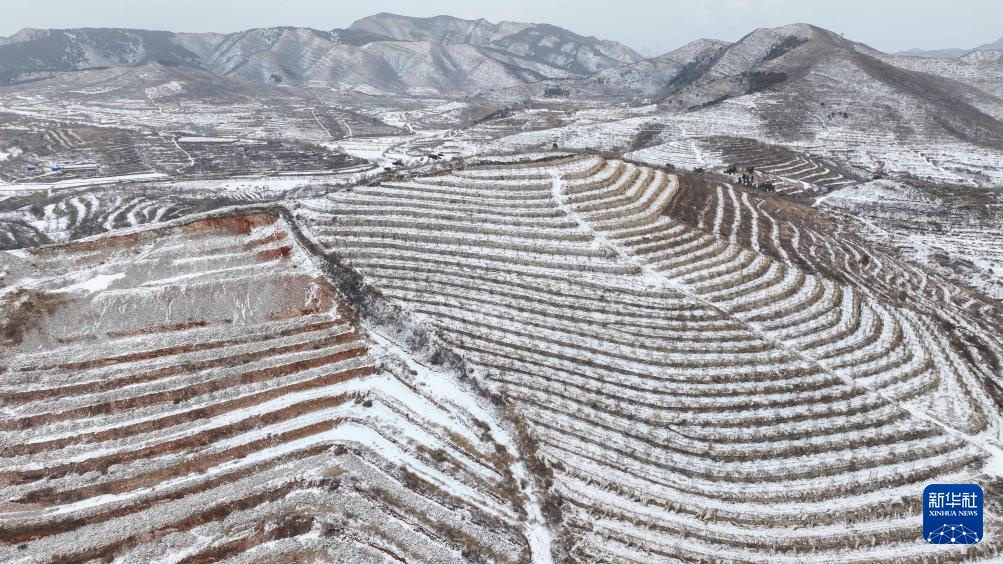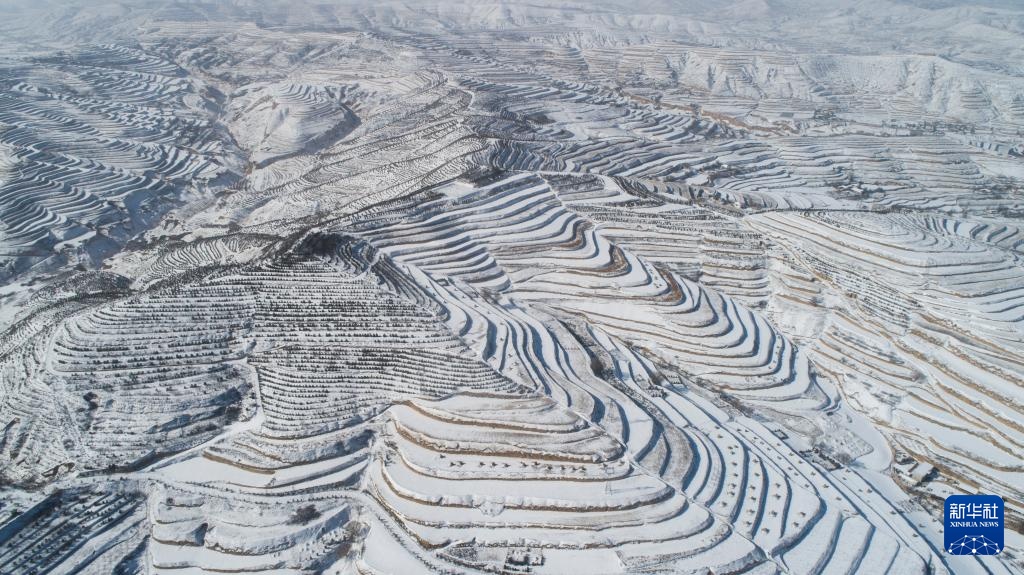1月26日在甘肃省平凉市静宁县双岘镇拍摄的雪后梯田(无人机照片)。