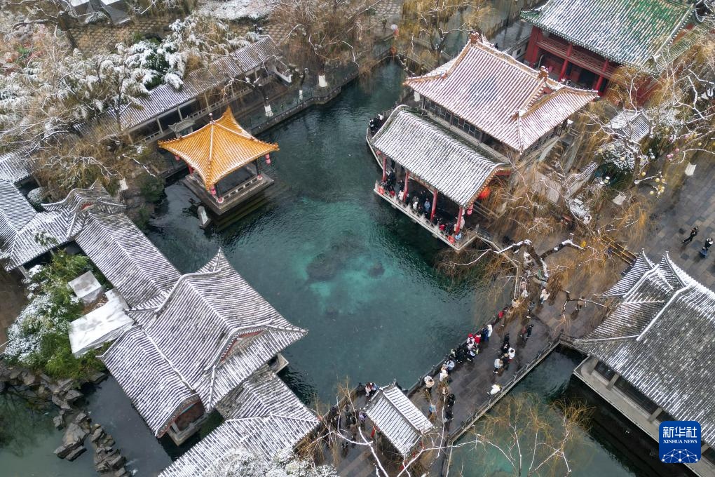 1月26日,人们在山东省济南市趵突泉公园观赏雪景(无人机照片)。