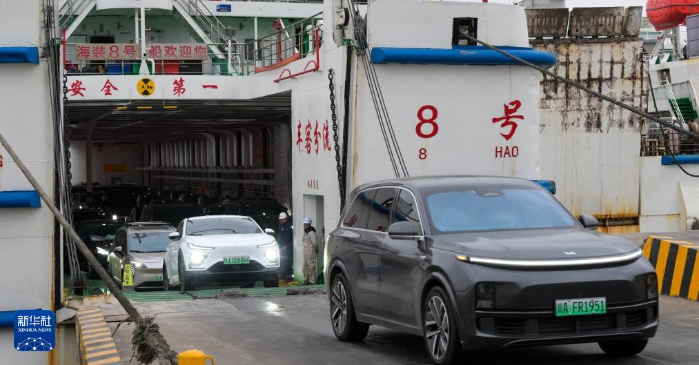 1月26日,在海南省海口市秀英港,新能源车专用运输船“绿源二号”装载结束后准备起航(无人机照片)。