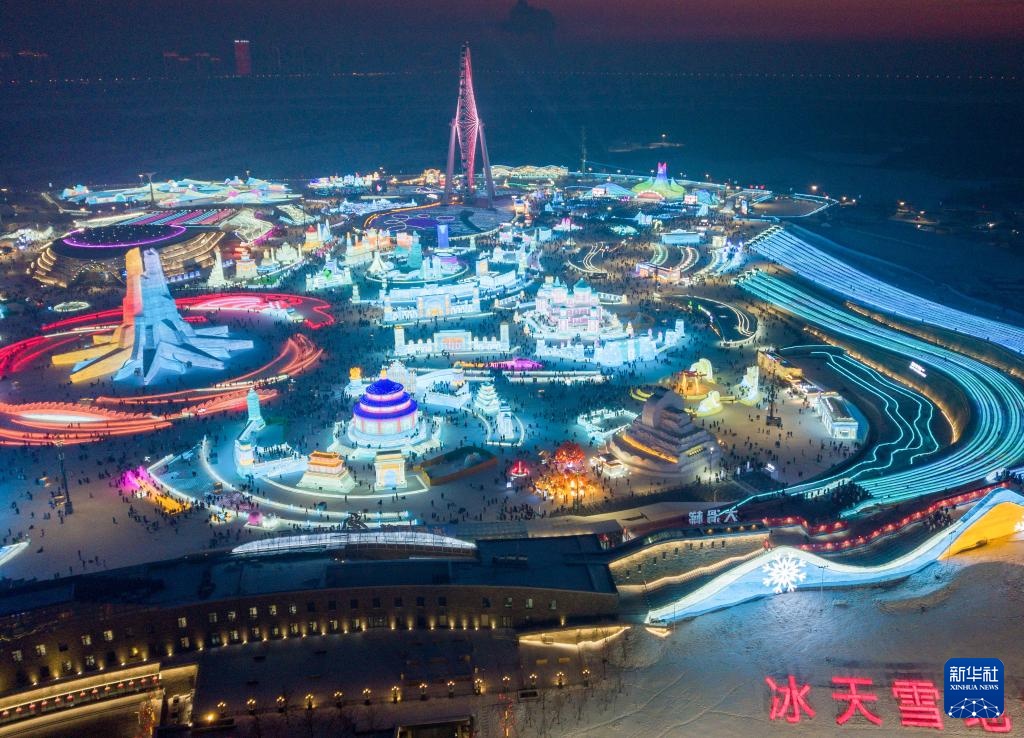 第二十六届哈尔滨冰雪大世界园区景观(1月23日摄,无人机照片)。