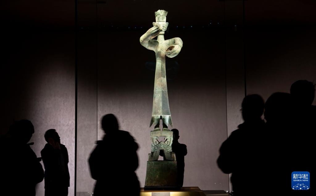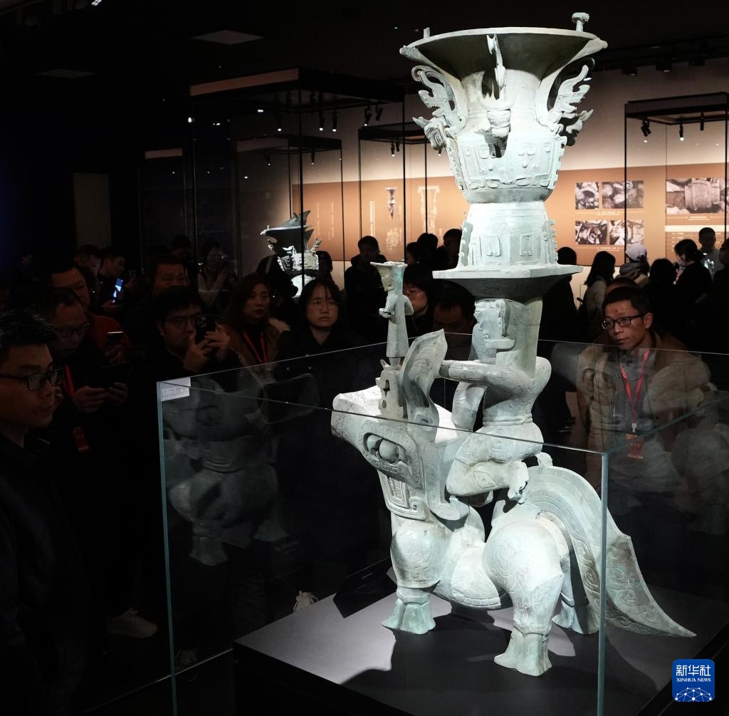参观者在三星堆博物馆新馆观看骑兽顶尊人像(2024年12月19日摄)。