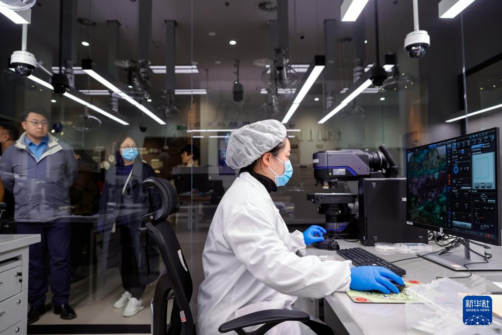 在三星堆博物馆新馆的文物保护和修复中心,文物保护修复人员蔡秋彤用三维视频超景深显微镜观察研究三星堆出土文物锈蚀样品,吸引参观者隔着玻璃观看(2024年12月18日摄)。