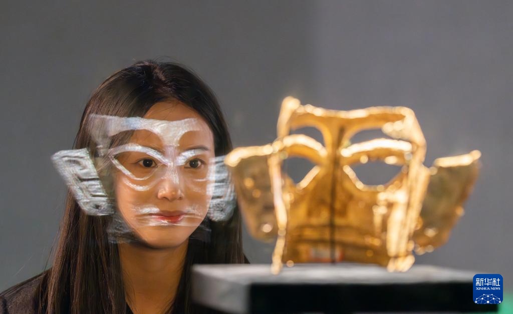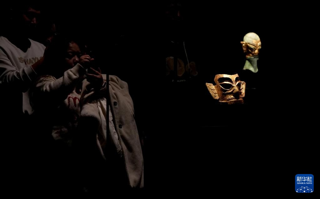 参观者在三星堆博物馆新馆展厅内观看展出的黄金面具(2024年12月18日摄)。
