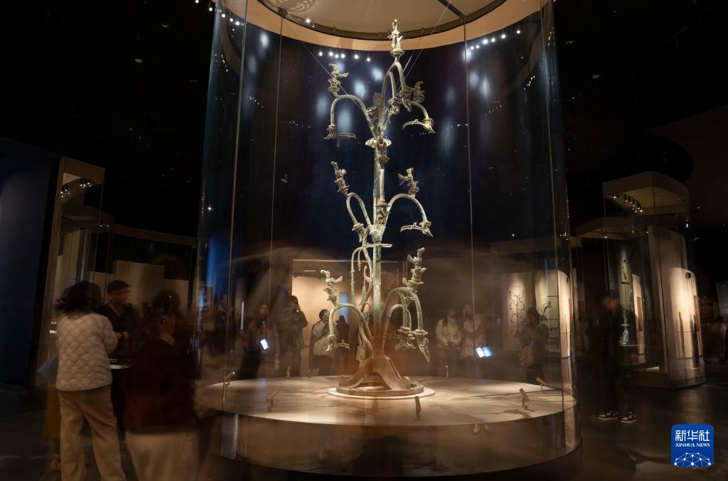 参观者在三星堆博物馆新馆参观青铜神树(2024年12月18日摄)。