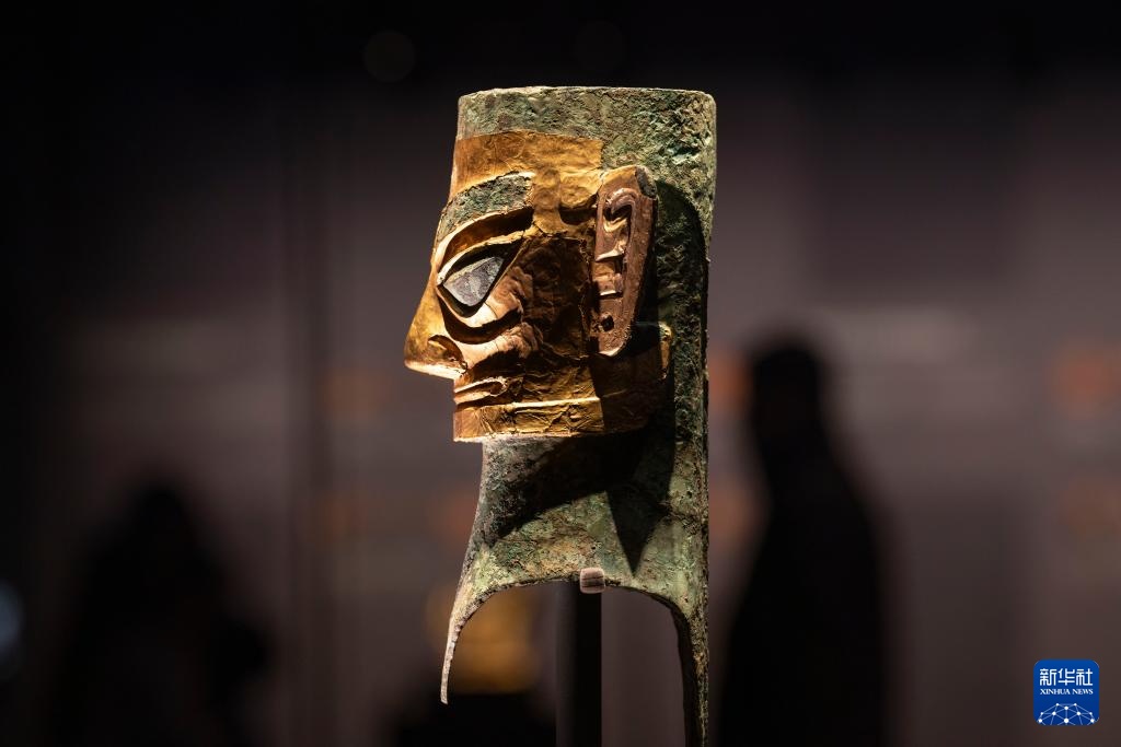 2024年12月18日在三星堆博物馆新馆拍摄的戴金面罩青铜人头像。