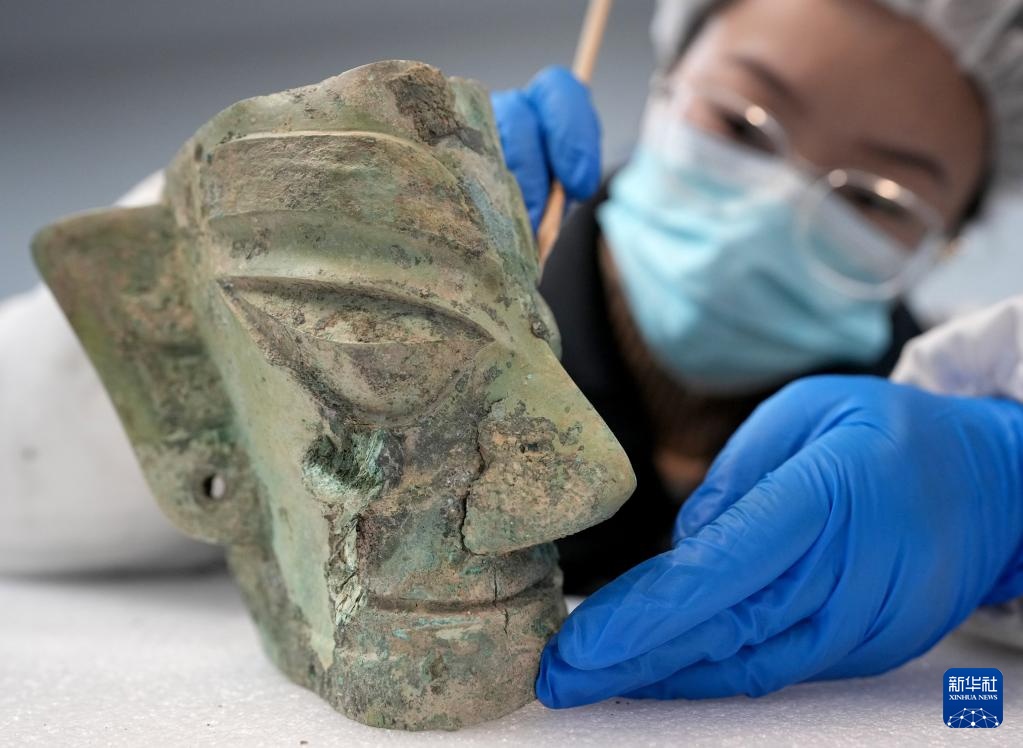 文物保护修复人员郑芦在清除三星堆遗址3号祭祀坑出土的青铜面具上的附着物(2024年12月18日摄)。
