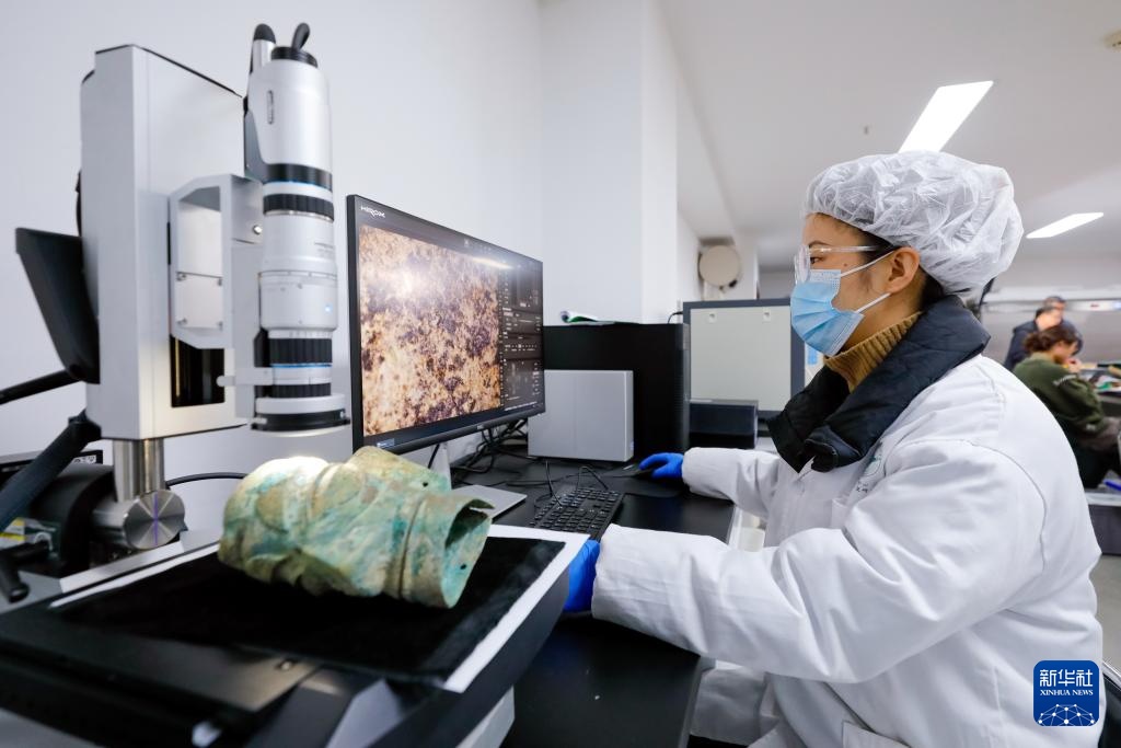文物保护修复人员郑芦用超景深显微镜观看三星堆遗址3号祭祀坑出土的青铜面具的表面细节(2024年12月18日摄)。
