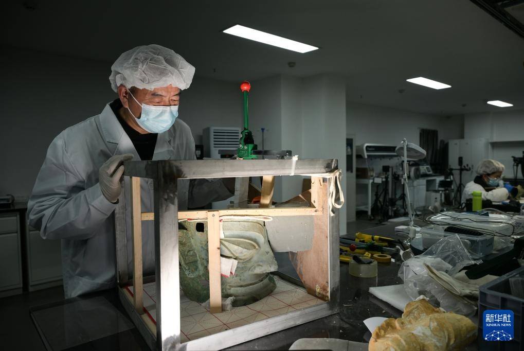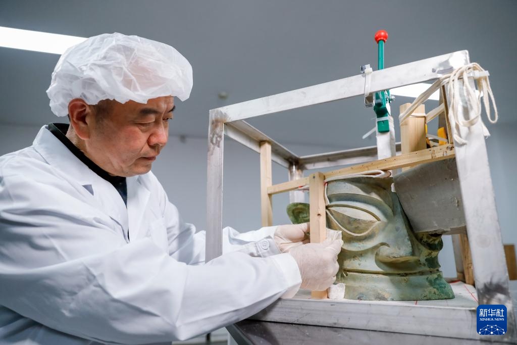 文物修复专家郭汉中在文物修复室内查看修复中的青铜面具(2024年12月18日摄)。