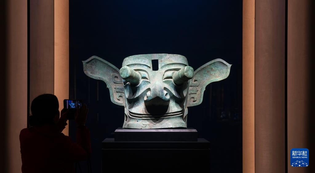 2024年12月18日在三星堆博物馆新馆拍摄的青铜纵目面具。