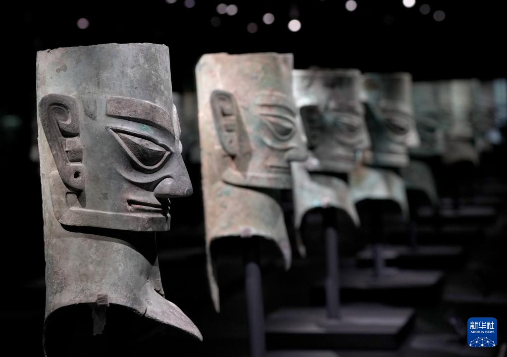 2021年出土于三星堆3号祭祀坑的青铜人头像(左一)和2022年出土于三星堆8号祭祀坑的青铜人头像(2024年12月19日摄,拼版照片)。