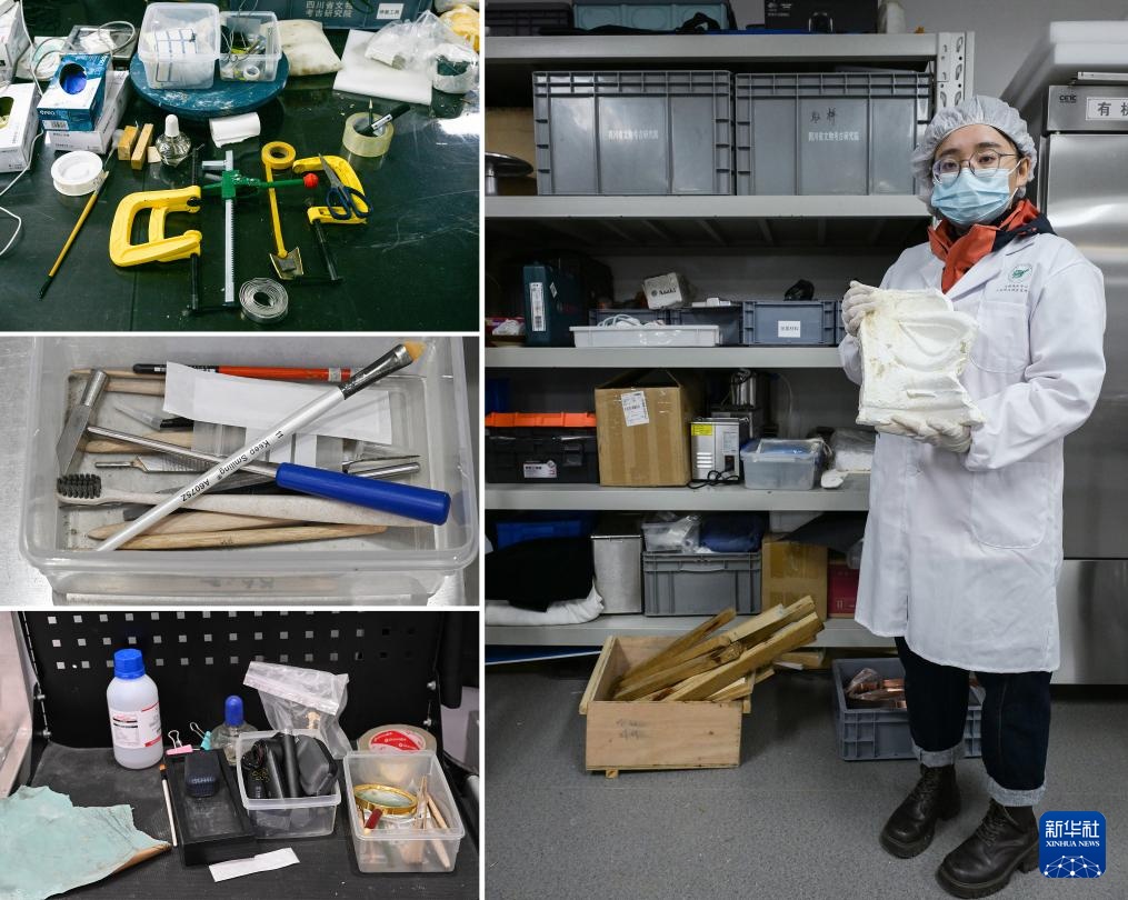 拼版照片。左图:文物修复师在修复工作中使用的部分工具;右图:一名文物保护修复人员在文物修复室内工具架前展示用于修复青铜面具的模具(2024年12月18日摄)。