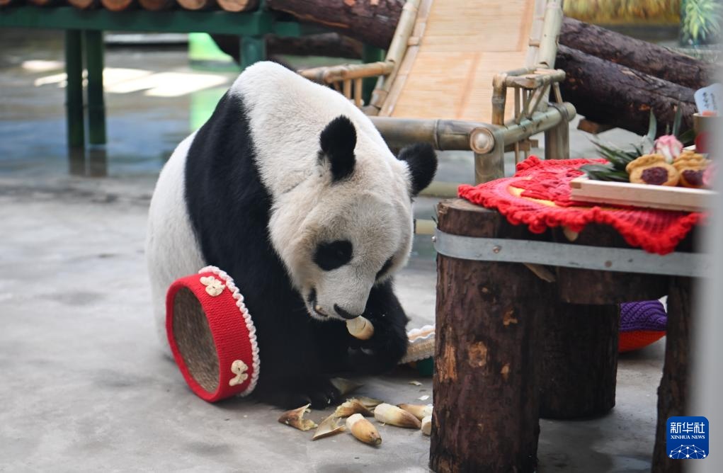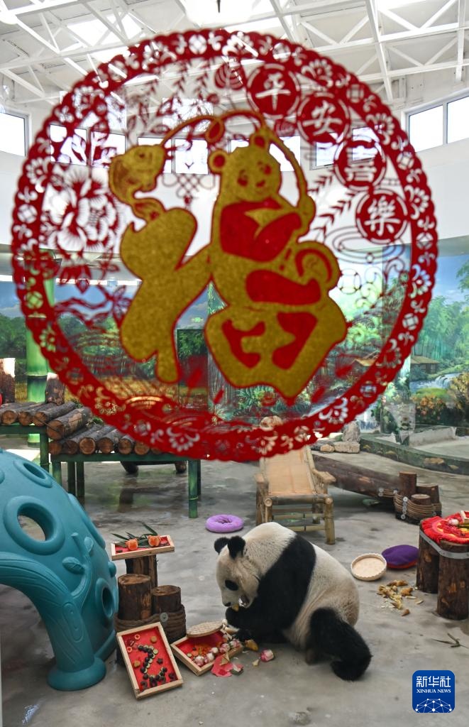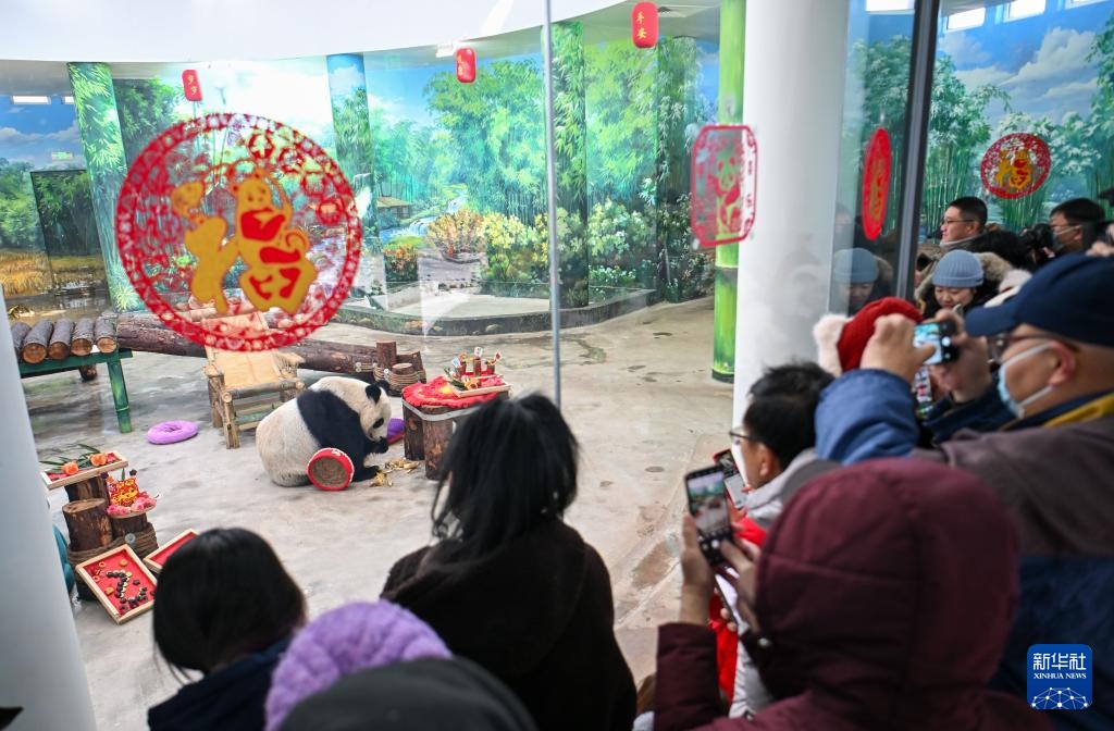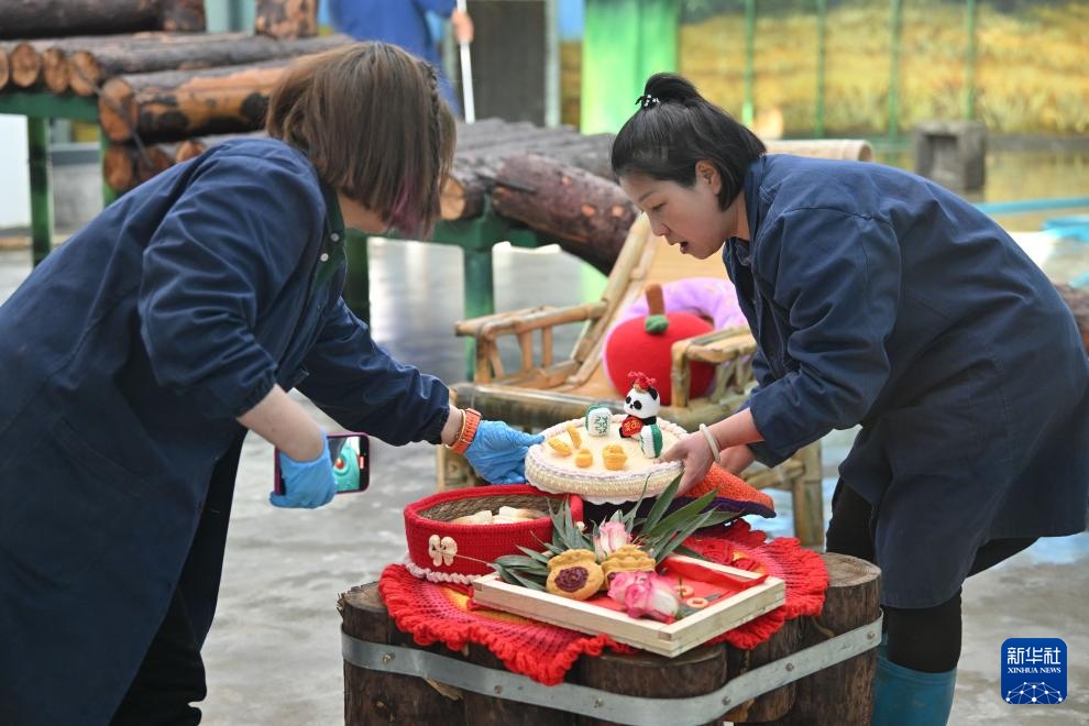当日,天津动物园的保育员和营养师团队为园区内的大熊猫“喜乐”“格格”精心准备了丰盛的节日大餐,让“国宝”们尽享浓郁年味儿。