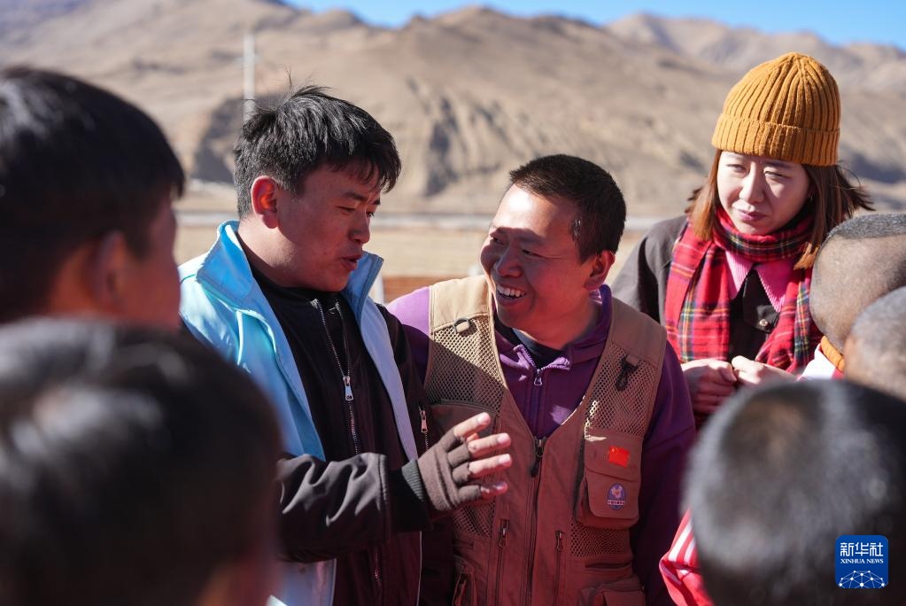 1月26日,定日县曲洛乡完全小学操场上,中科院心理研究所志愿者李晓景(右二)和其他志愿者交流。