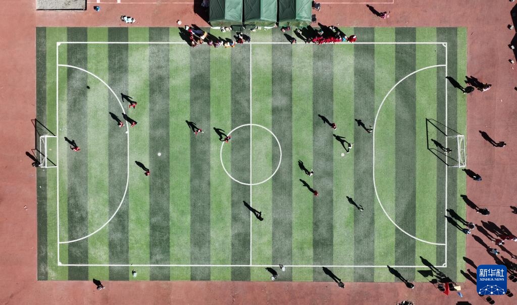 1月26日,定日县曲洛乡完全小学操场上,长所乡嘎旦村和曲洛乡措昂村的孩子们在进行足球比赛(无人机照片)。