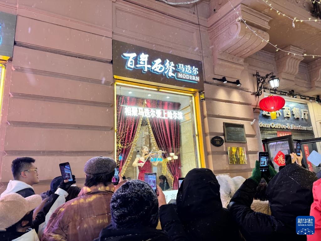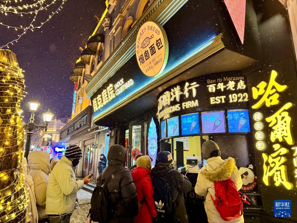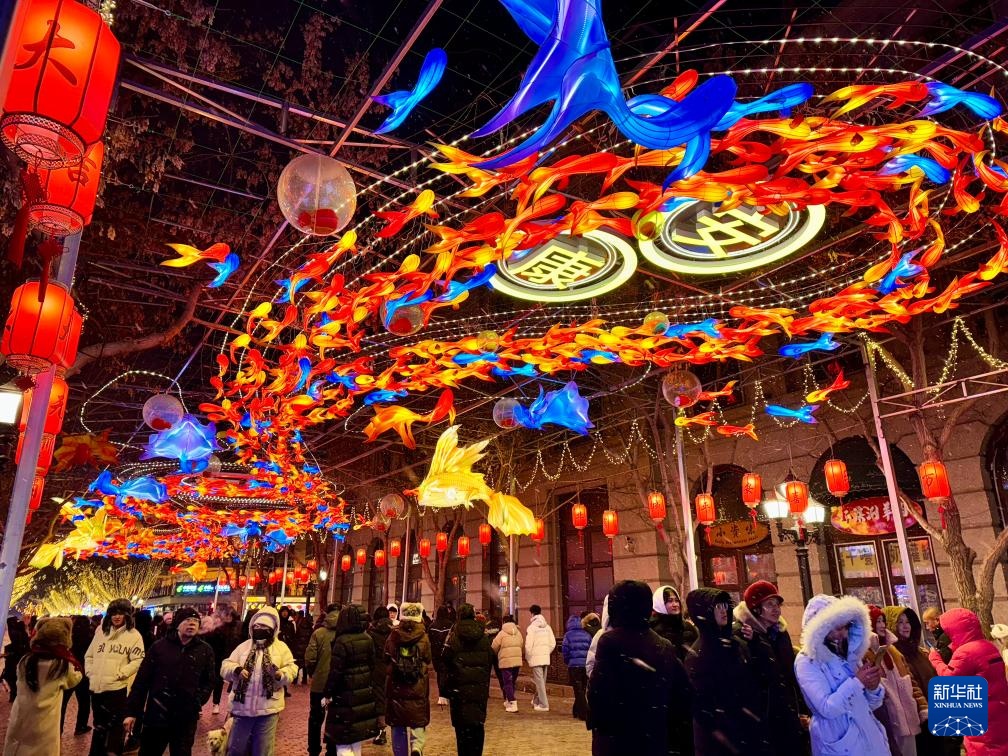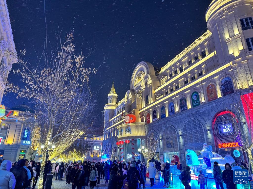除夕夜,哈尔滨下起小雪。市民和游客来到中央大街,感受冰天雪地中的别样年味。