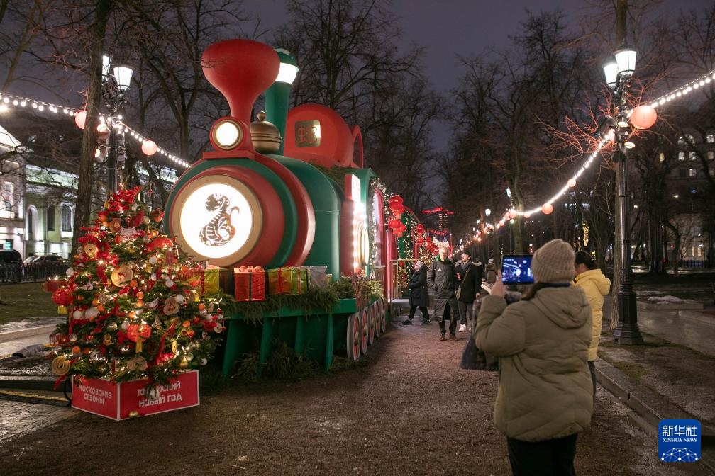 1月28日,在俄罗斯首都莫斯科市中心,市民拍摄蛇年主题的列车装饰。