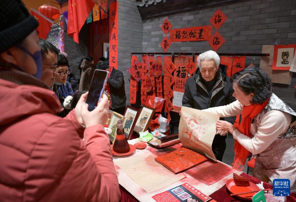 1月29日,观展者在北京中国非物质文化遗产馆举行的“过年——春节主题展”上体验“木版年画”制作技艺。