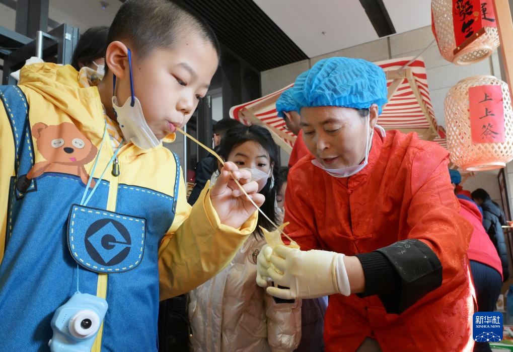 1月29日,小朋友在北京中国非物质文化遗产馆举行的“过年——春节主题展”上“吹糖人”。