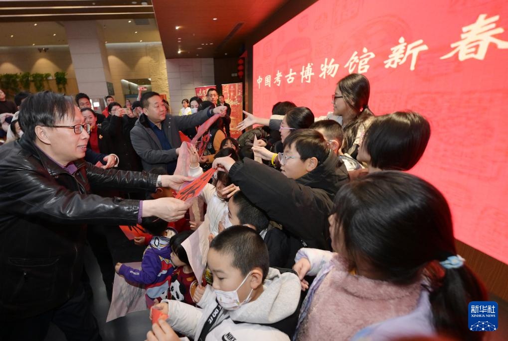 1月29日,北京中国考古博物馆负责人向参观者赠送福字。