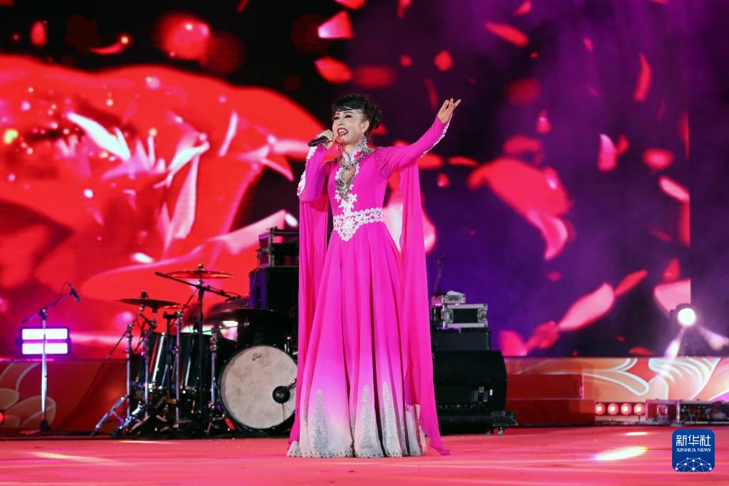 1月26日,在泰国那空沙旺湄南河畔举行的春节庆祝活动上,新疆艺术剧院木卡姆艺术团的表演者演唱《一杯美酒》。