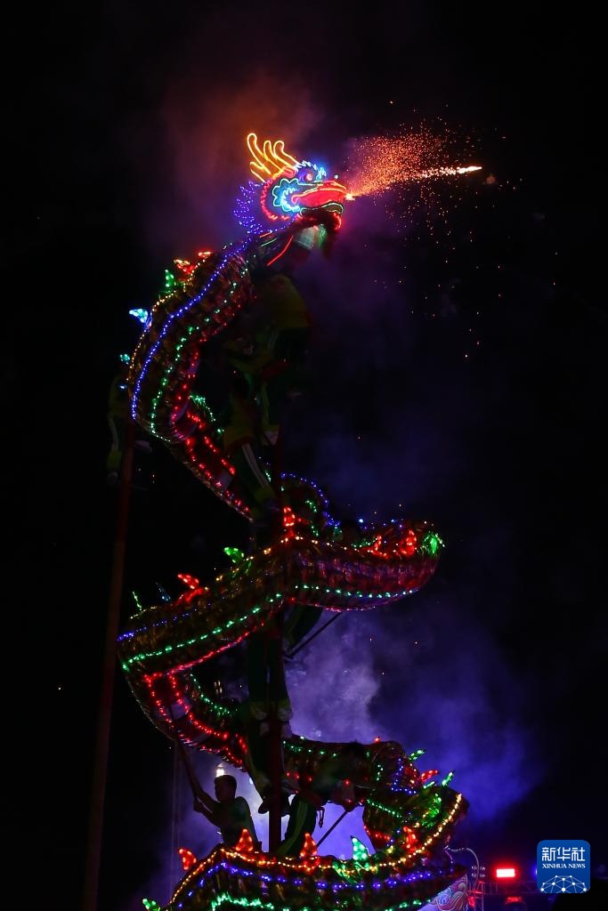 1月26日,演员在泰国那空沙旺湄南河畔举行的春节庆祝活动上表演高空舞龙。