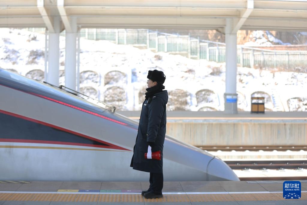 1月29日,宝兰高铁甘肃定西北站的工作人员在站台上送车。