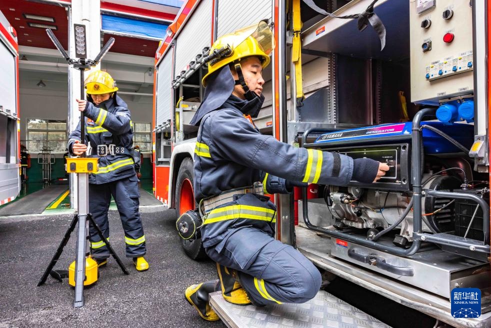 1月29日,消防救援人员在贵州省安顺经济技术开发区消防救援大队检查装备。
