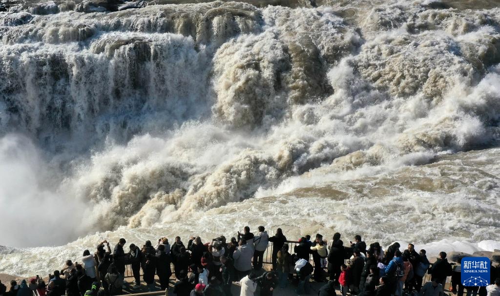 1月29日,游客在山西吉县观看黄河壶口瀑布(无人机照片)。