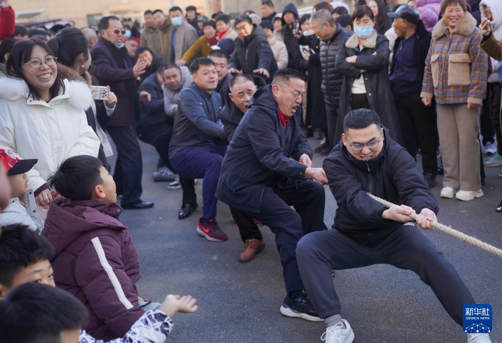 1月29日,山东省邹平市西董街道段家村村民在拔河。