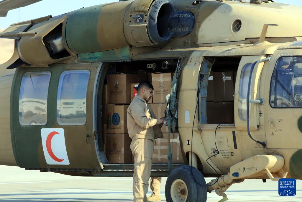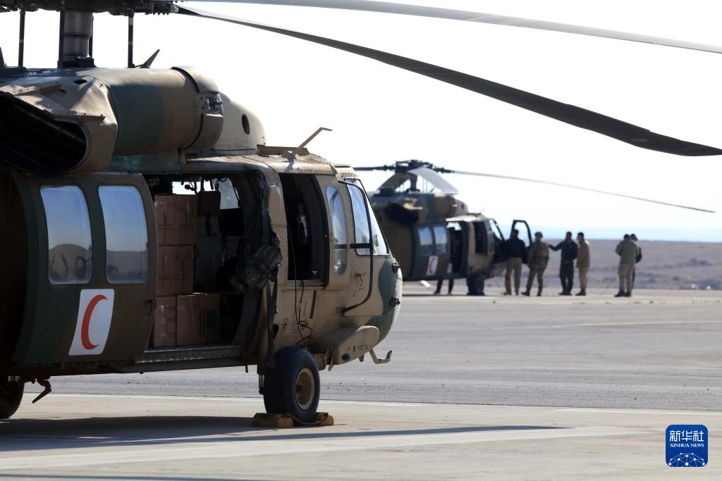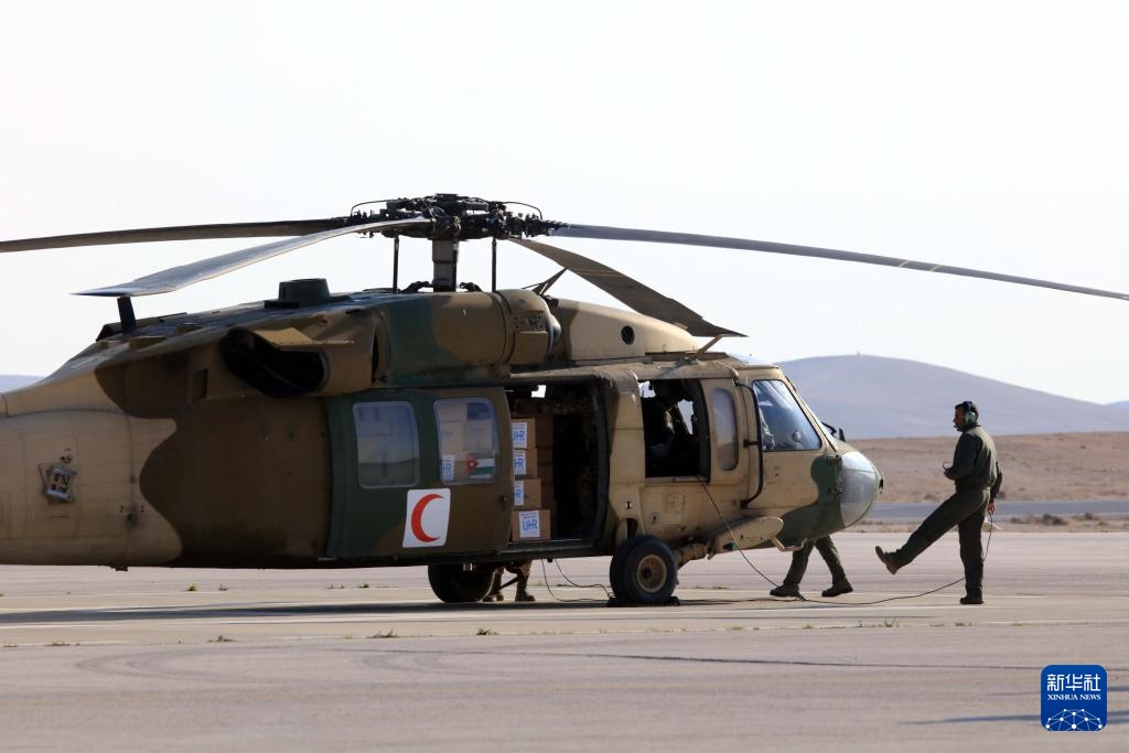 1月29日,在约旦首都安曼的阿卜杜拉二世空军基地,载有人道主义援助物资的直升机准备前往加沙。
