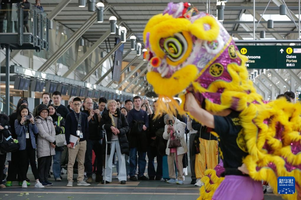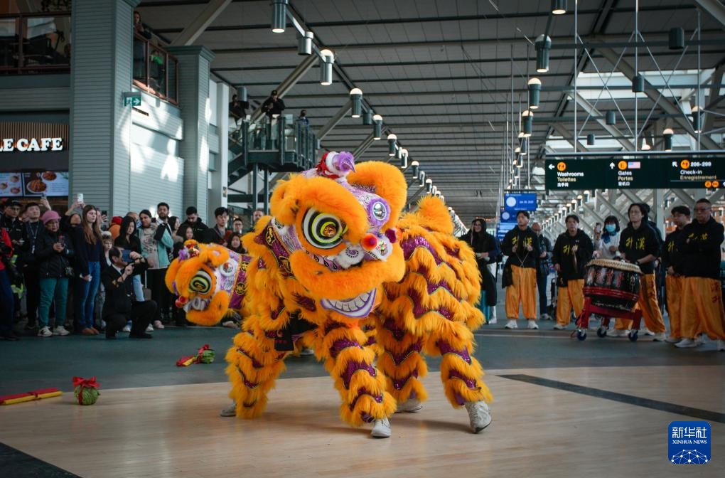 1月29日,在加拿大里士满,人们在温哥华国际机场欣赏舞狮表演。