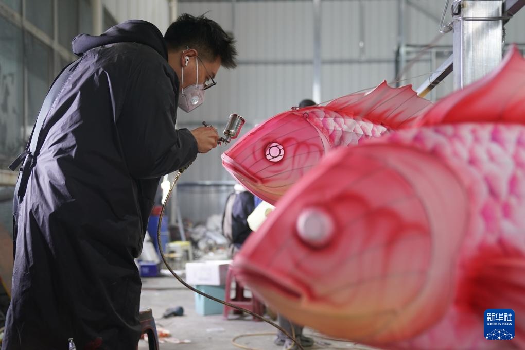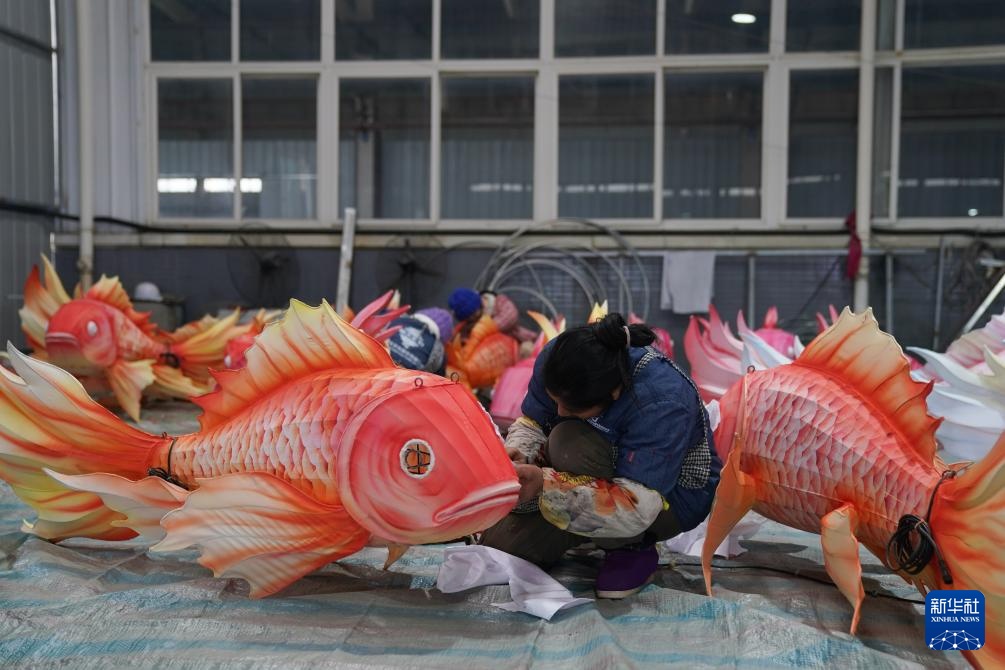 1月14日,在一处彩灯生产车间内,裱糊工对彩灯局部进行装饰。
